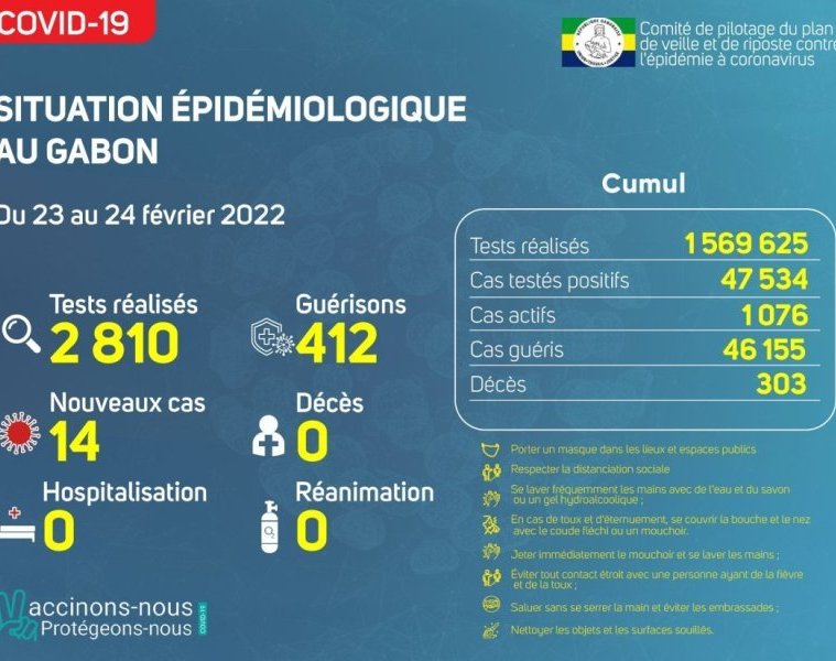 GabonMatin vous livre le point journalier du Comité de pilotage du plan de veille et de riposte contre l’épidémie à Coronavirus au Gabon du 24 février 2022.