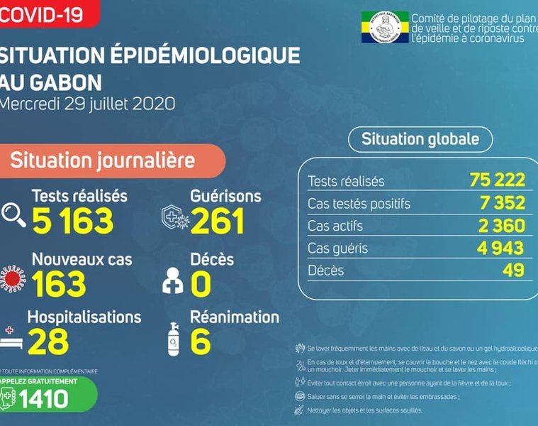 Gabon Matin vous livre le point journalier du Comité de pilotage du plan de veille et de riposte contre l’épidémie à Coronavirus au Gabon du 29 juillet 2020.