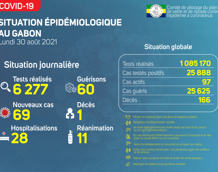 Gabon Matin vous livre le point journalier du Comité de pilotage du plan de veille et de riposte contre l’épidémie à Coronavirus au Gabon du 30 août 2021.