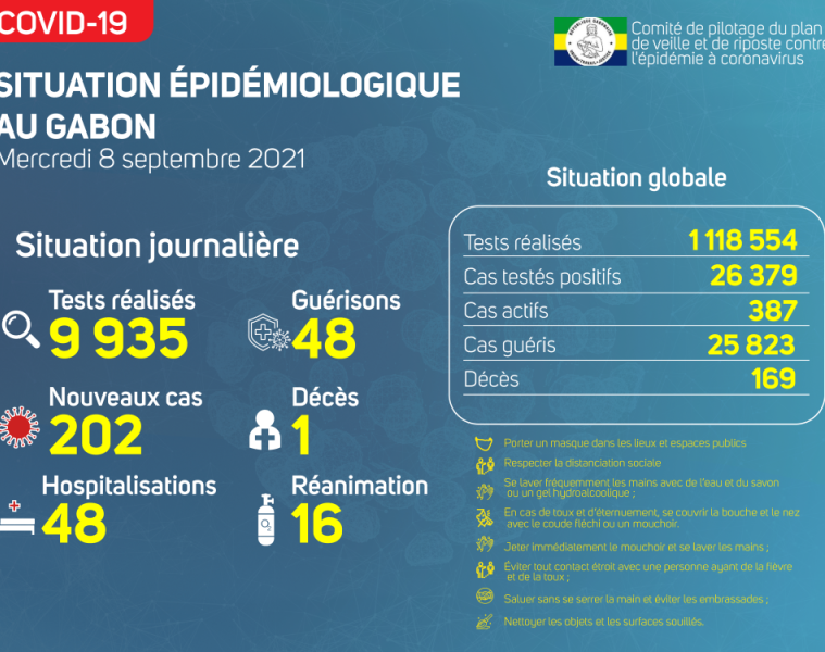 Gabon Matin vous livre le point journalier du Comité de pilotage du plan de veille et de riposte contre l’épidémie à Coronavirus au Gabon du 8 septembre 2021.