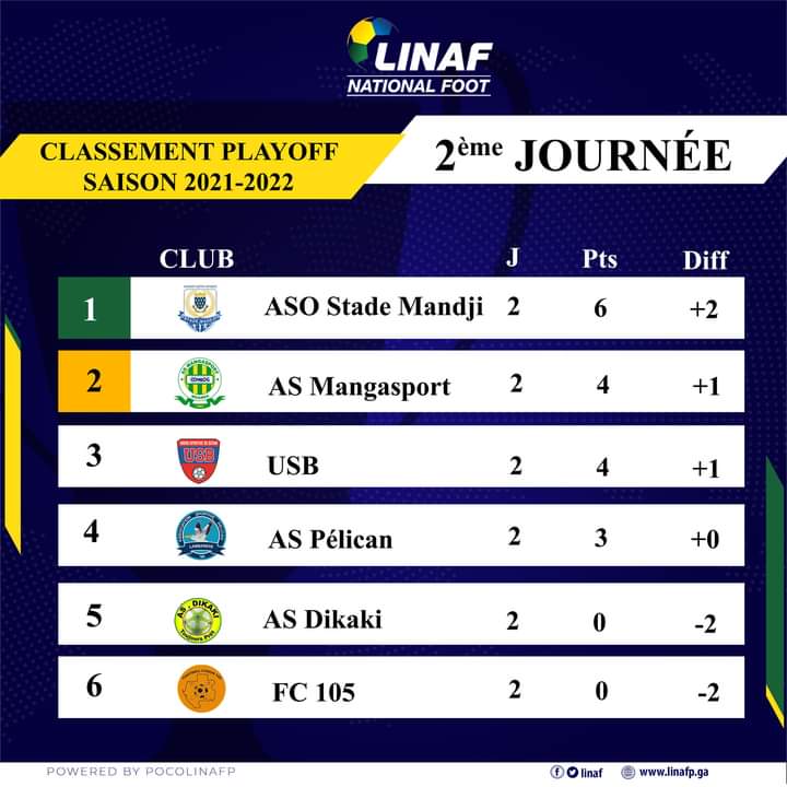 Un nul qui arrange la formation Port-Gentillaise qui prend la tête du classement à deux longueurs des Moandais et Oyemois. En effet l’ASO Stade Mandji s’est défait 1 but à 0 de son vis à vis, le Football Canon 105 sur ses propres installations et tout naturellement est la lanterne de ces playoffs.