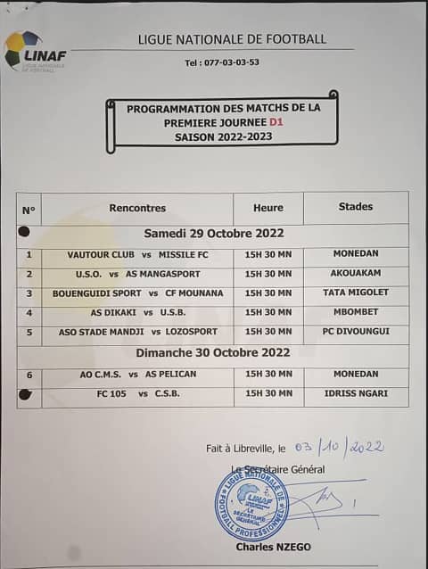 C’est l’une des informations rendues publiques par Brice Mbika, le président de la Ligue nationale de football (Linaf) aux clubs de première division le mercredi 5 octobre à Libreville. Un choc militaire pour lancer le National Foot saison 2022-2023. Il opposera Missile FC à Vautour Club.