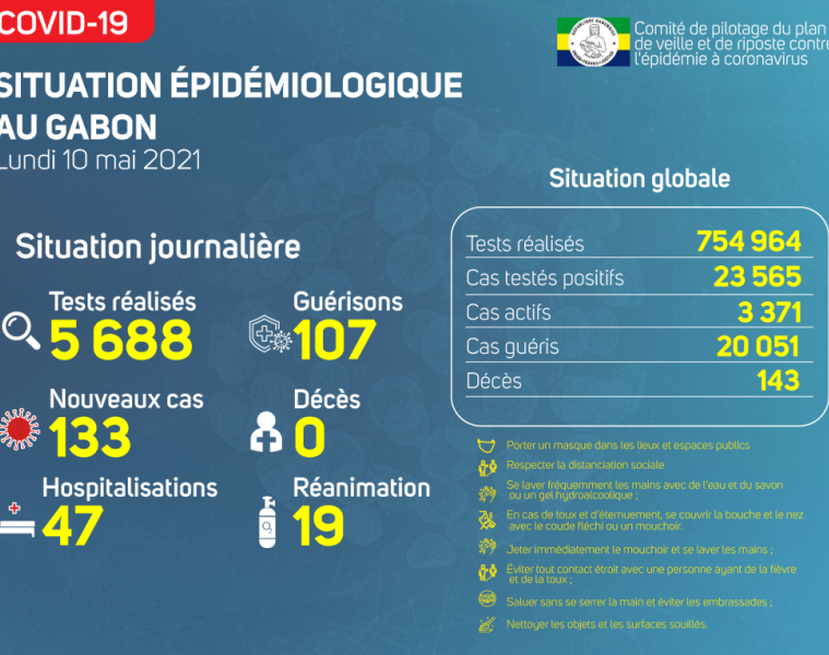 Gabon Matin vous livre le point journalier du Comité de pilotage du plan de veille et de riposte contre l’épidémie à Coronavirus au Gabon du 10 mai 2021.