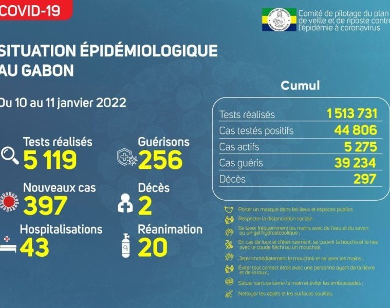 GabonMatin vous livre le point journalier du Comité de pilotage du plan de veille et de riposte contre l’épidémie à Coronavirus au Gabon du 11 janvier 2022.