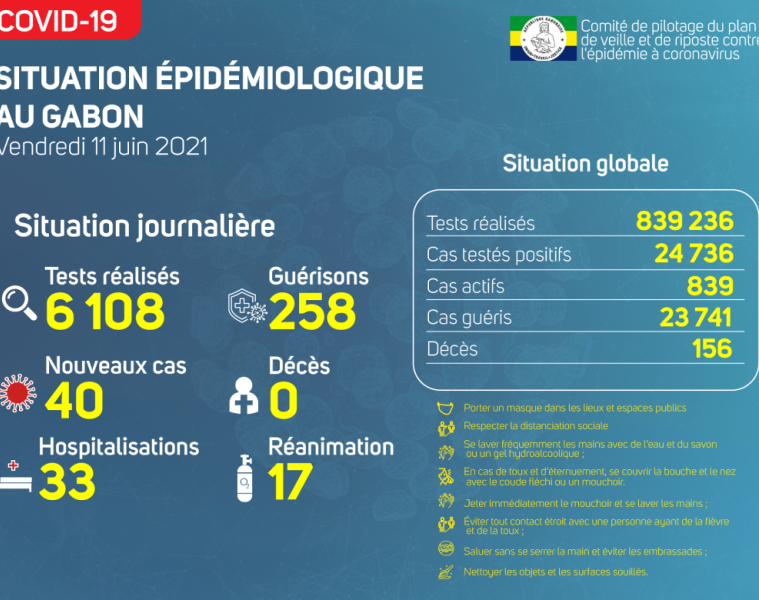 Gabon Matin vous livre le point journalier du Comité de pilotage du plan de veille et de riposte contre l’épidémie à Coronavirus au Gabon du 11 juin 2021.