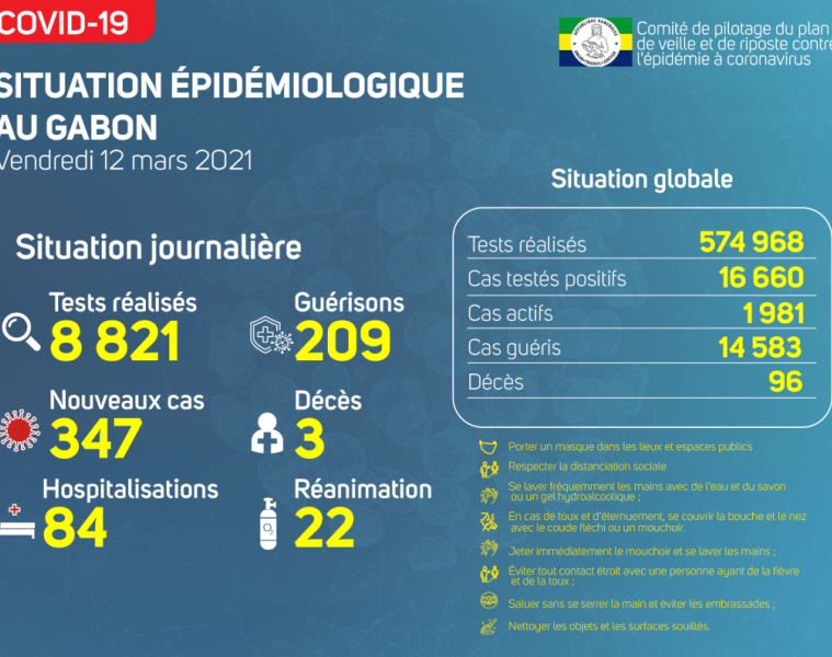 Nous avons enregistré 347 nouveaux cas positifs sur 8 821 tests réalisés, soit un taux de positivité de 3,9%, 84 personnes hospitalisées dont 22 en réanimation pour détresse respiratoire, 209 guérisons et 03 nouveaux décès notifiés à Libreville.