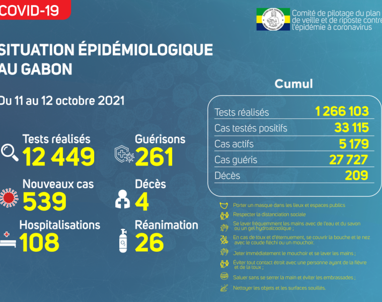 Nous avons enregistré 539 nouveaux cas positifs sur 12 449 tests réalisés, soit un taux de positivité de 4.3%, 108 personnes hospitalisées dont 26 en réanimation pour détresse respiratoire, 261 nouvelles guérisons et 04 nouveaux décès à Libreville.