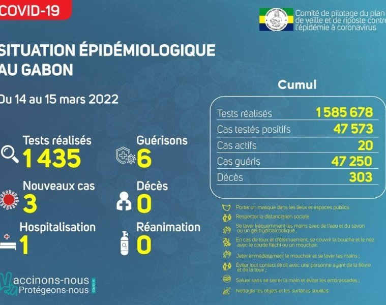 GabonMatin vous livre le point journalier du Comité de pilotage du plan de veille et de riposte contre l’épidémie à Coronavirus au Gabon du 15 mars 2022.