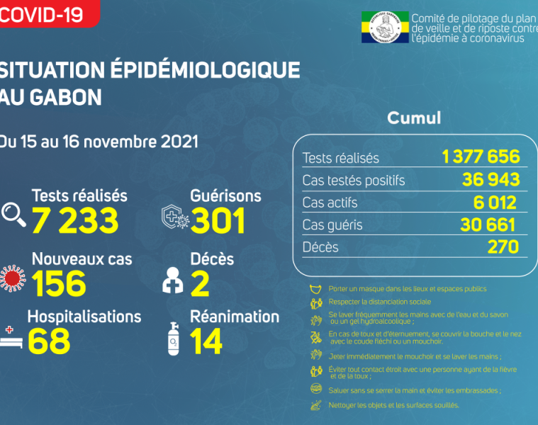 Gabon Matin vous livre le point journalier du Comité de pilotage du plan de veille et de riposte contre l’épidémie à Coronavirus au Gabon du 16 novembre 2021.