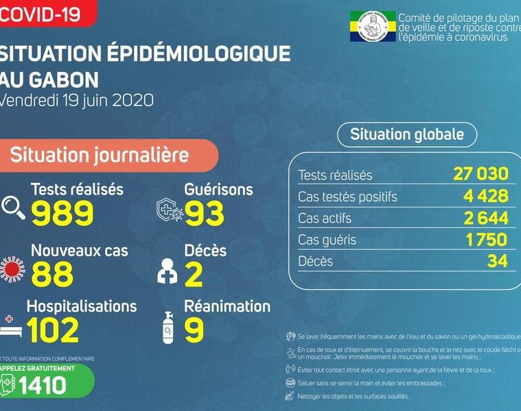 Gabon Matin vous livre le point journalier du Comité de pilotage du plan de veille et de riposte contre l’épidémie à Coronavirus au Gabon du 19 juin 2020.