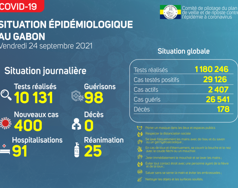 Gabon Matin vous livre le point journalier du Comité de pilotage du plan de veille et de riposte contre l’épidémie à Coronavirus au Gabon du 24 septembre 2021.
