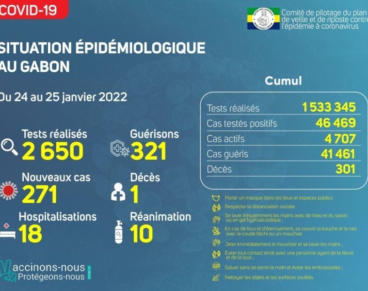GabonMatin vous livre le point journalier du Comité de pilotage du plan de veille et de riposte contre l’épidémie à Coronavirus au Gabon du 25 janvier 2022.