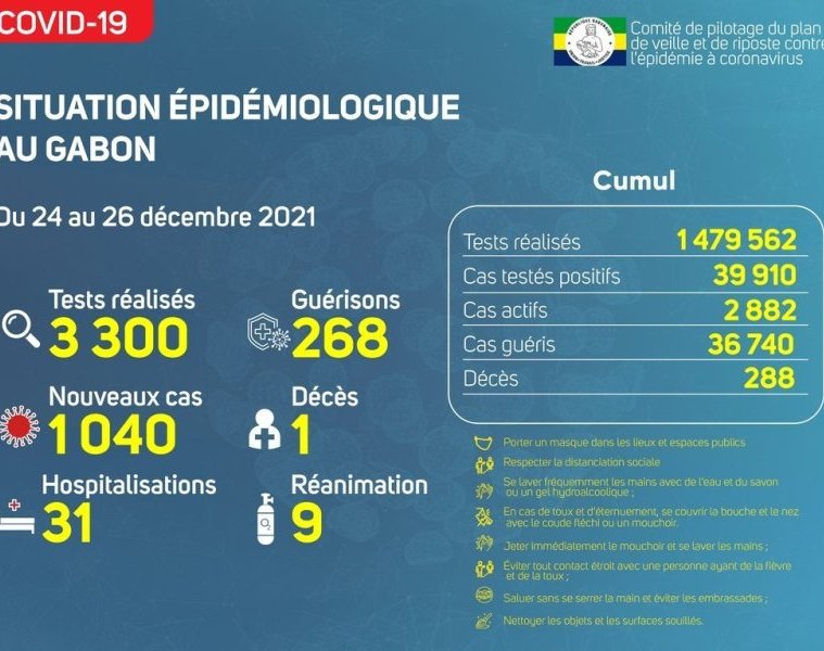 Gabon Matin vous livre le point journalier du Comité de pilotage du plan de veille et de riposte contre l’épidémie à Coronavirus au Gabon du 26 décembre 2021.