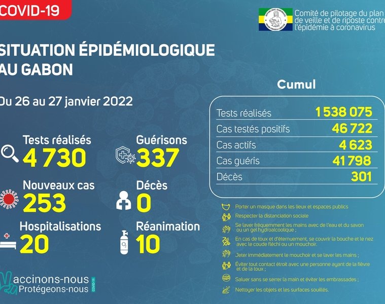 GabonMatin vous livre le point journalier du Comité de pilotage du plan de veille et de riposte contre l’épidémie à Coronavirus au Gabon du 27 janvier 2022.