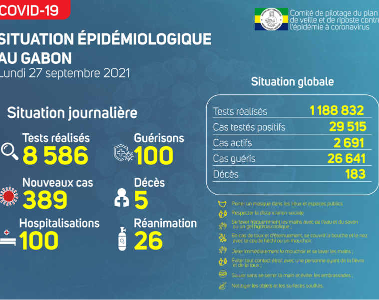 Nous avons enregistré 389 nouveaux cas positifs sur 8 586 tests réalisés, soit un taux de positivité de 4.5%, 100 personnes hospitalisées dont 26 en réanimation pour détresse respiratoire, 100 nouvelles guérisons et 05 nouveaux décès Libreville.