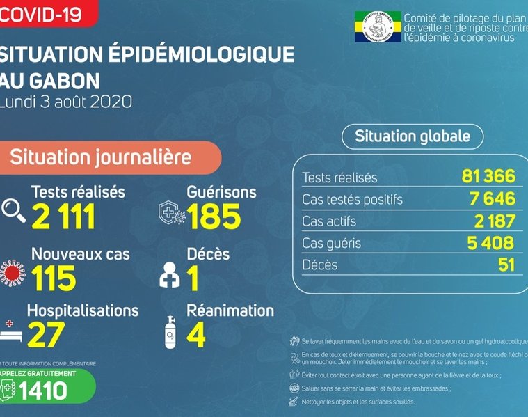 Gabon Matin vous livre le point journalier du Comité de pilotage du plan de veille et de riposte contre l’épidémie à Coronavirus au Gabon du 3 août 2020.