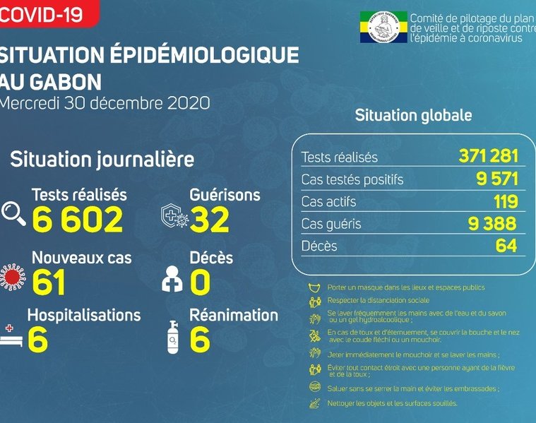 Gabon Matin vous livre le point journalier du Comité de pilotage du plan de veille et de riposte contre l’épidémie à Coronavirus au Gabon du 30 décembre 2020.