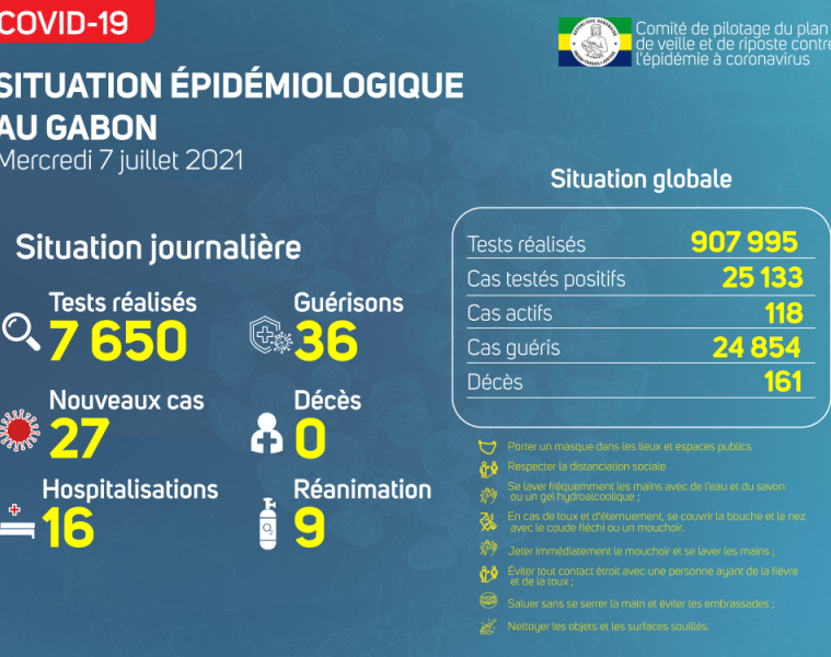 Gabon Matin vous livre le point journalier du Comité de pilotage du plan de veille et de riposte contre l’épidémie à Coronavirus au Gabon du 7 juillet 2021.