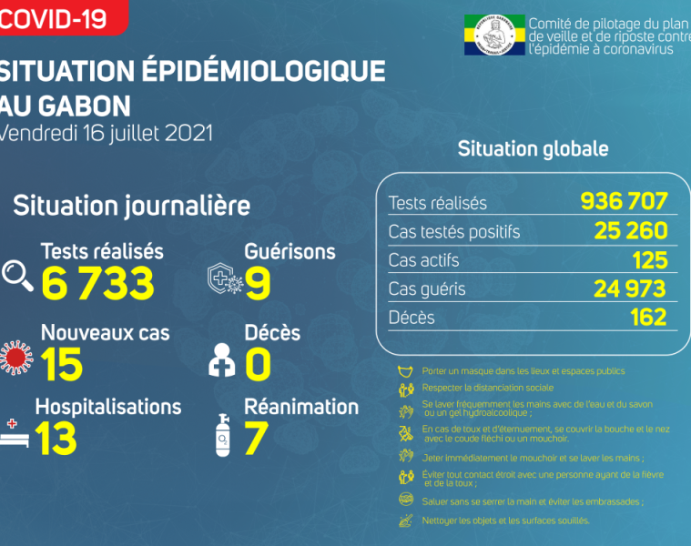 Gabon Matin vous livre le point journalier du Comité de pilotage du plan de veille et de riposte contre l’épidémie à Coronavirus au Gabon du 16 juillet 2021.